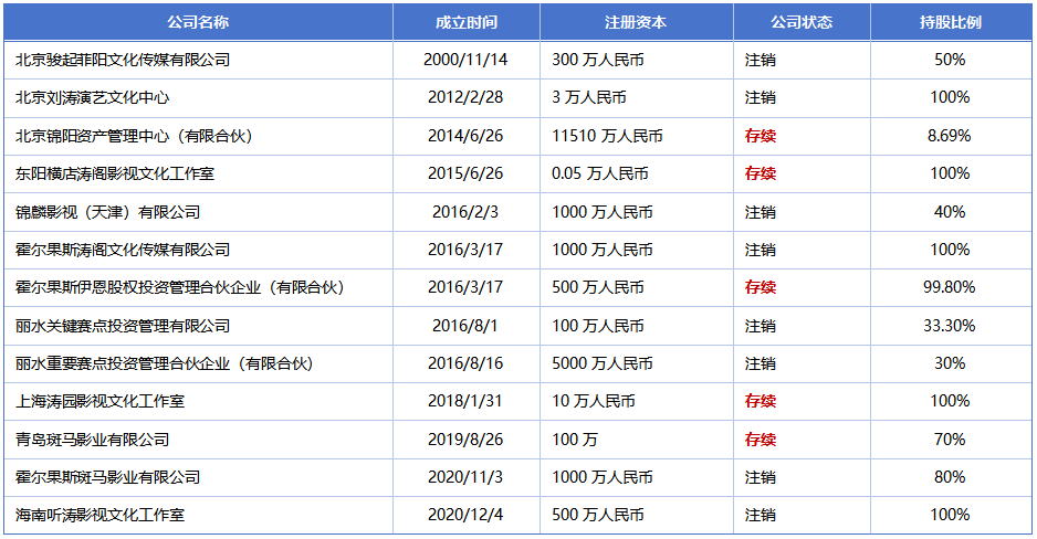 根据天眼查信息整理显示,目前王珂所投资存续的公司仅有三家,其中两家:青岛斑马影业有限公司、海南听涛影视文化工作室,刘涛分别占股70%和100%。